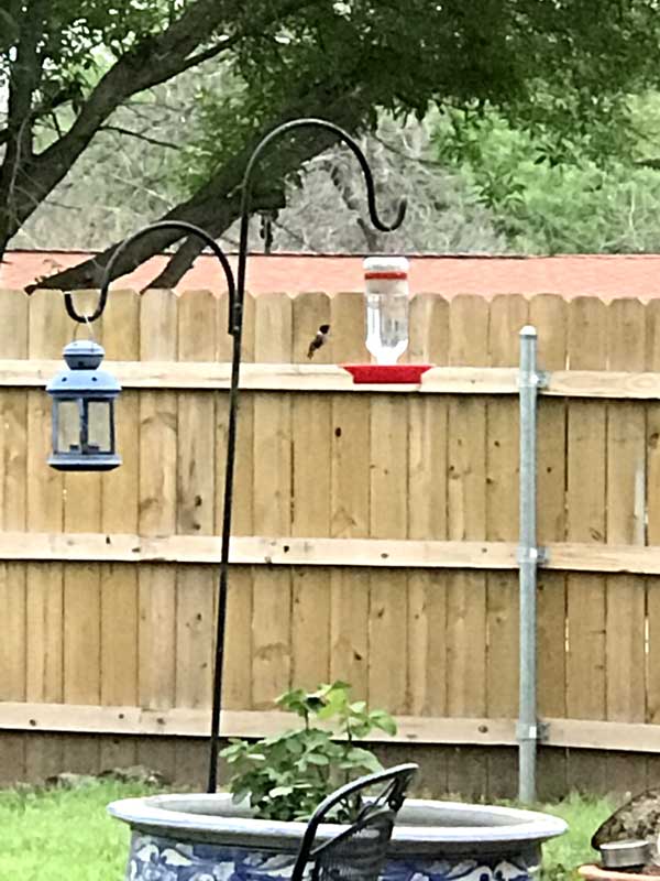 Being Rufous the little birds protect their feeders. Four feeders saw many aerial combats between up to fifteen mini flyers zooming back and forth across …