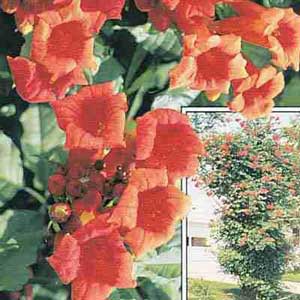 The Trumpet Creeper, Campsis radicans, is a rapid growing clinging vine that produces bright red orange trumpet shaped flowers up to 3 inches long.